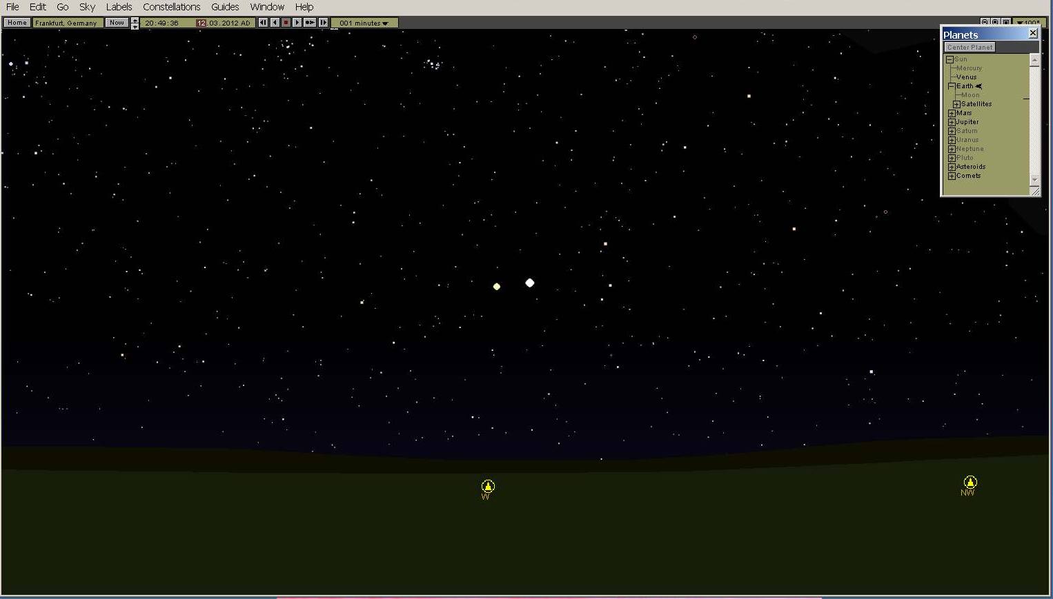 Da muß ich dich enttäuschen, die Konjuktion von Merkur und Uranus findet leider im hellen, sprich nach Aufgang der Sonne statt, aber wenn man nicht genau weis, wo sie stehen, ist es auch bei dunkelheit schwer, diese beiden lichtschwachen Planeten auszumachen. Da machen die Medien oft viel Wind, aber am Himmel ist das meist sehr unspektakulär.Ich denke übereinander schiebt sich Venus und Jup. nicht, zumindest von uns aus gesehen. Am 11.03.2012 nähert sich Venus und am 12. hat sie Jup überholt...von uns aus gesehen. Die Tage davor und danach sind sie sich auch schon sehr nahe, also lohnt es sich für interessierte, wenn der Himmel klar ist, einen Blick nach oben zu werfenDanke. Bin gespannt. Und krieg ich dann auch in natura den chromgelben Merkur und den grünen Uranus zu sehen?