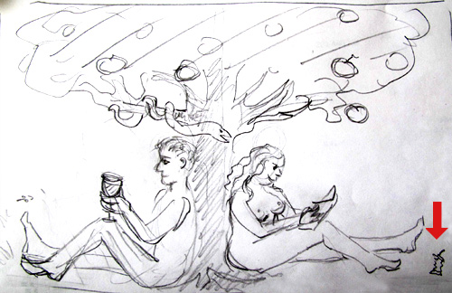 Aber Mohn (ich hätte auch noch schöne Grüne Fliesen!) und Feuersalamander finde ich auch super! Grübel, gerübel ...Anbei mal eine Skizze zu der Adam und Eva Geschichte. Meine werden übrigens nicht aus dem Paradies vertrieben.