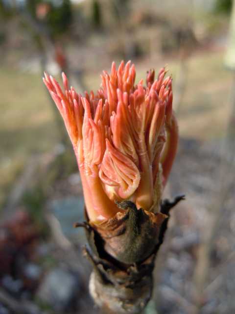 Paeonia delavayii "Colwals Form" sieht doch nicht ganz erfroren aus. Sie zeigt plötzlich "rot" in der dürren Knospe