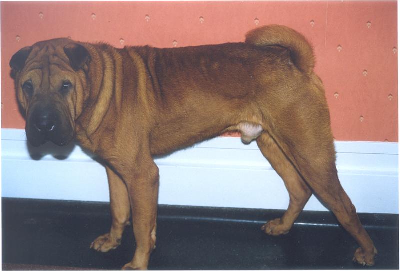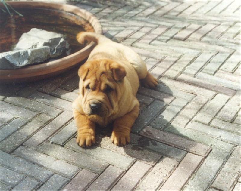 Hier noch ein Foto von Taifoon in "erwachsener Pose".Der dumme Gesichtsausdruck ist wieder puuuuuuuuuuuuure Tarnung. Ausserdem ist er "ostindisch taub"( hört nur was er will , eine durchaus vorwiegend männliche Tugend ). Eigentlich hört er wirklich nur auf das Kommando KEKS, genau wie seine Schwester und auch diese "Masche"ist volle Absicht und durchaus gewollt.Ewig in Erinnerung werden mir die peinlichen Auftritte beim Hundetraining beibleiben und der grinsende Trainer mit dem mehrmals am Abend wiederholenden Spruch: Du sollst wissen warum du einen Sharpei genommen hast. ( selbst züchtete er eine andere hier nicht zu nennende Sorte, die aber nichts dafür kann.....Die natürlich schadenfrohen Gesichter der anderen Teilnehmer sind grosszügig aus meiner Memory verschwunden. Wir haben sie einfach sharpeilike ignoriert.Diese Kurse waren also komplet für die "Katz". Bald hätte ich dafür eine Hypothek aufnehmen müssen. Nun habe ich eine bessere Methode , ich besteche einfach mit den tollen Wörtchen : KEKS. Ich wollte meine haarigen bestechlichen Freunde , keine Minute vermissen.Ich liebe unabhängige , nicht untertänige Hunde, sie kommen meinem Naturel am Nächsten . LG