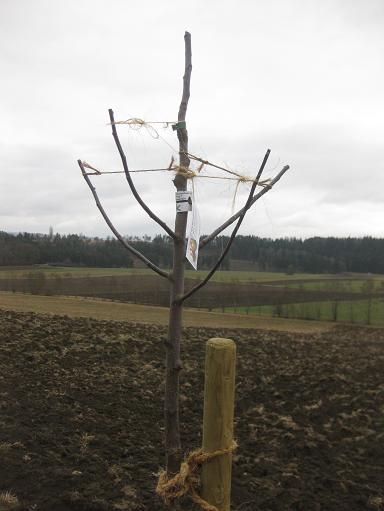 Das ist ein Rheinischer Winterrambour. Hier waren alle künftigen Leitäste etwas zu flach. Daher musste ich alle hochbinden. Die (stärksten) obersten Äste waren leider als Leitäste nicht zu gebrauchen, da sie viel zu steil standen und ich Schlitzäste so gut es geht vermeiden möchte.