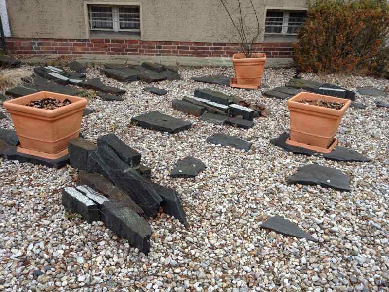 So wie Vorgärten eben zu dieser Art von Architektur sonst aussehen. Aber die Schieferstücke sind saugut. Sowas kann im Garten auch sehr gute Dienste tun.