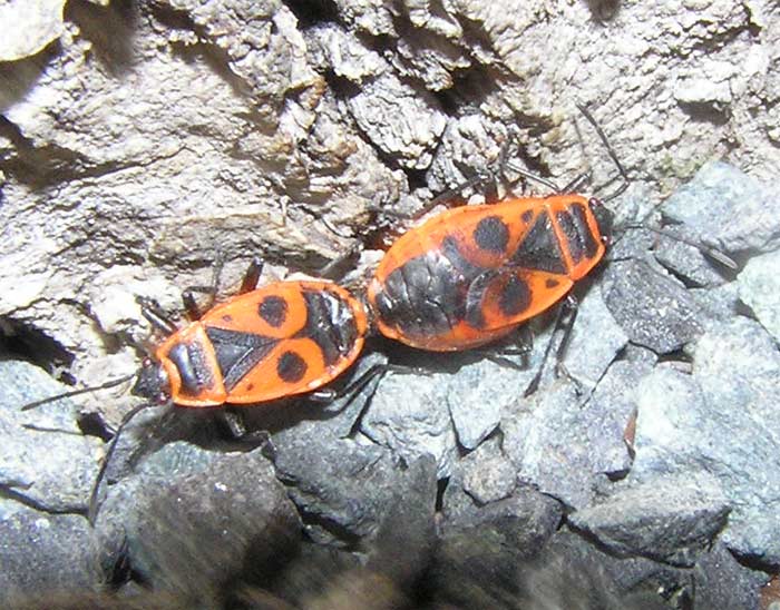 Hier war der Sechs bereits erfolgreich. Erwachsene und jugendliche Feuerwanzen, ich habe aber im Moment schon 4 Generationen, die heute aufgrund des schlechten Wetters aber nicht so schön wie sonst (in Massen) zusammen saßen.