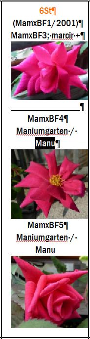 FBB, ich klinke mich auch grad mal hier ein. Die Rose vom letzten Jahr, mit der Odyssee, bis ich sie hatte, wie war noch ihre Bezeichnung? Die habe ich gestern untern den Töpflern angetroffen, sieht auch recht gut aus und treibt schön. Ich würde sie dann auch gleich anschreiben. Sie hat schon einen etwas grösseren Topf erhalten.Hallo Manu, schön zu hören und vor allem auch mal zu sehen! Also anbei mal ein Screenshot aus meiner Datei der 2011 Gekeimten, hier das Feld der Kombination Mamy Blue gekreuzt mit Bright Fire. Insgesamt gab es 6 Sämlinge, 3 haben bereits im ersten Jahr geblüht, die anderen stehen noch hier (stachelige Dinger!)Wie du auf dem Screenshot siehst, hat Marcir auch eine bekommen, die aber das zeitliche gesegnet hat, das habe ich mit dem Kreuz dahinter markiert.