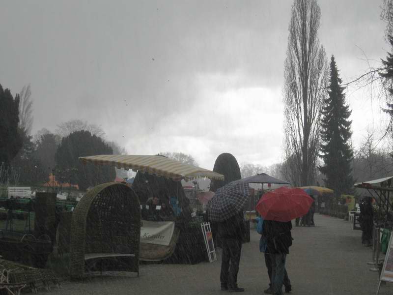 Damit das nicht passiert, haben die meisten Gärtner/ Aussteller während der ersten stärkeren Sturmböen die Planen von ihren Ständen genommen. Dann kam aber noch ein Unwetter mit Hagel, zum Glück nicht zu lange.