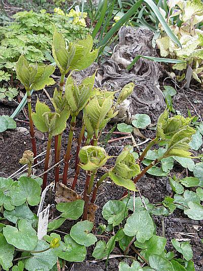 Uvularia zeigt nur einen mickrigen Trieb, aber Ranzania japonica hat recht viele Knospen, die aber noch keine Stängel haben, sondern direkt aus der Erde kommen. Das übliche seltsame Verhalten dieser Pflanze.Deinanthe hat den leichten Frost gut überstanden, ebenso Anemonopsis, aber von Podophyllum ´Spotty Dotty´ ist nichts zu sehen.Überraschenderweise ist ein Sämling von Corydalis nobilis einigermaßen weit von der Mutterpflanze entfernt aufgetaucht und blüht schon.