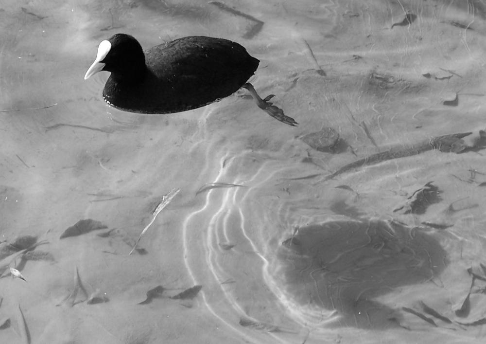 Ein kleines Blässhuhn wartet schon auf die ersten Schwimmer.