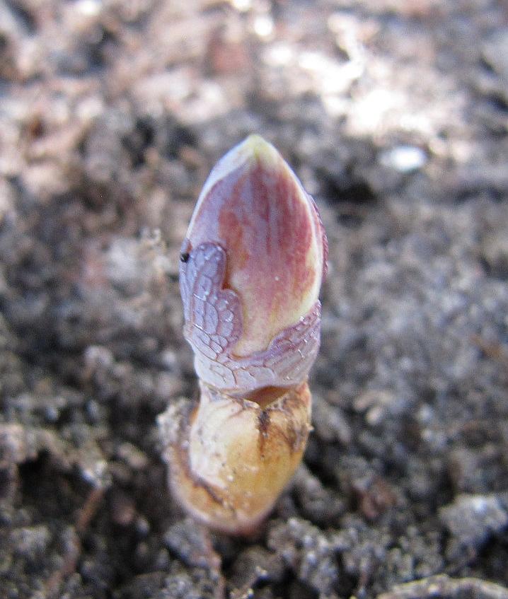 'Claude Shride' treibt aus. Diese Lilie will bei mir nie blühen, meistens bleiben die Knospen verkrüppelt. Letztes Jahr hatte sie ganz braune Blätter - und jetzt dies: heimlich hat sie offensichtlich eine zweite Zwiebel gebildet. Ich decke sie jetzt in Frostnächten ab...