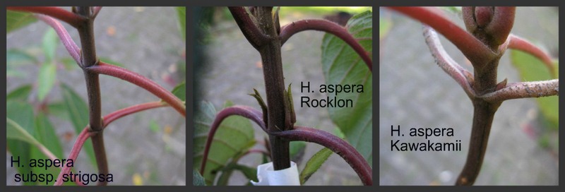 H. aspera 'Bellevue' scheint auf den ersten Blick wirklich eine 'Übergangsform' zwischen 'Macrophylla' und H. sargentiana zu sein.Hier das Laub im Vergleich. Es hat eher die Form von 'Macrophylla', dafür jedoch den deutlich gezähnten Blattrand meines H. sargentiana-Typs.