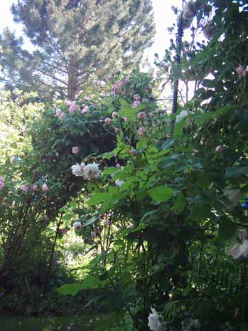 Rechts die kleine ist Mme Isaac Pereire, ich hoffe, sie entschließt sich endlich, mal etwas zu wachsen. Links ist Annie Vibert, leider ist sie im diesjährigen Winter bis zur Anhäufelung trotz Winterschutz runtergefroren. Deshalb will ich ihr im Herbst einen anderen Platz geben, etwas geschützter und dort kann sie hoch wachsen oder auch wieder runterfrieren. Links im Hintergrund blüht noch Mrs. John Laing an dem Zäunchen.Also suche ich vorerst auf die linke Seite eine Rose. Eigentlich wie Annie V. , also kleinere Blüten, dauerblühend, historische Rose und hellrosa-weiß, evtl. noch leicht überhängende Blüten ... und natürlich den Rosenbogen üppig bedeckend.Schwierig, schwierig. Als alle Rosen im Garten noch blühten, hatte ich mich schon für einen einmalblühenden Rambler entschieden, aber jetzt ist nicht mehr viel los in dieser Ecke und so etwas dauerblühendes hätte schon was. Falls es nicht anders geht, würd ich auch ein etwas dunkleres Rosa in Betracht ziehen. Ursprünglich hätte mir auch Mme Caroline Testout Clbg. gefallen, aber die ist ja weder kleinblütig noch überhängend ::)Vielleicht habt ihr aber auch einen ganz anderen Vorschlag ? LG von Steffi