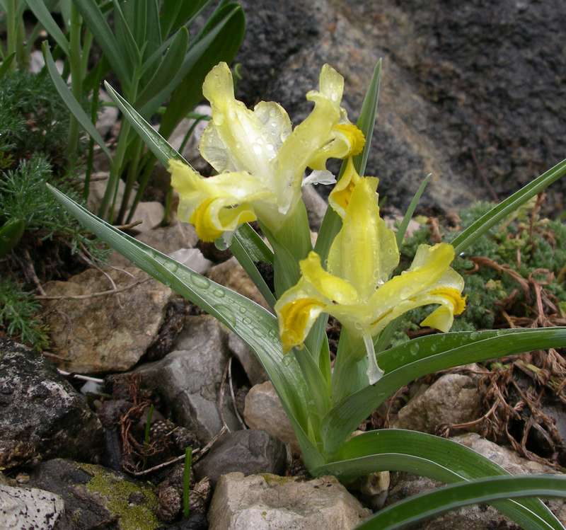 Eine ganz kleine Form der Iris bucharica im Regen. Es gibt durchaus einige Junoirisarten, die absolut gartentauglich sind und keinerlei Schutz brauchen. Diese gehört dazu.