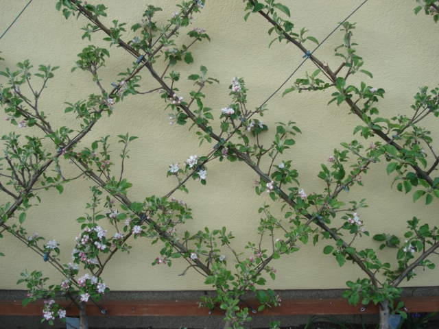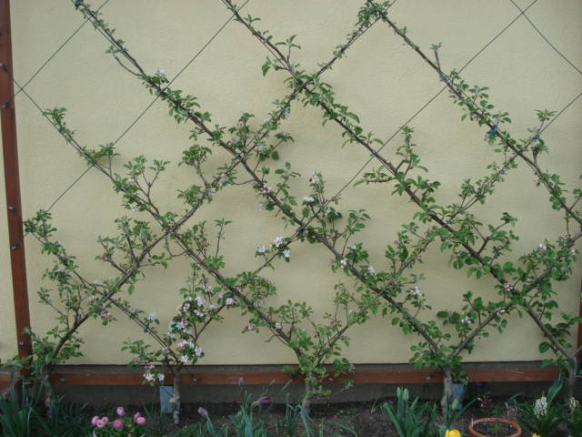 hi macarantha,dieses spalier habe ich im herbst 2007 angelegt. die gepflanzten 2-jährigen veredelungen habe ich recht knapp über der veredlungsstelle abgeschnitten und auf die entwicklung der schlafenden augen vertraut. das beigefügte foto ist von 2008.kdb
