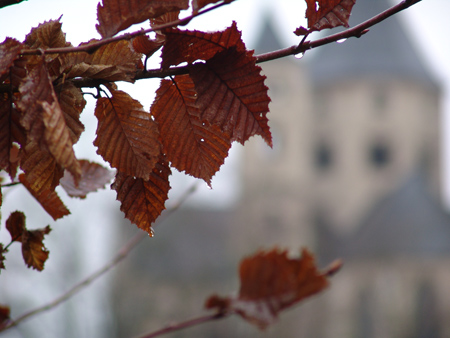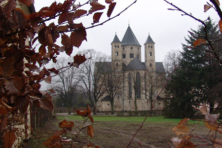 Das Motiv war unbefriedigend, also fuhr ich nach dem seinerseits befriedigenden Geschäftstermin zu einer bekannten romanischen Klosterkirche in der Nähe. Dort fand ich einen regnerischen Testplatz hinter einer Buchenhecke:3. Knechtsteden total - beachte Ast links oberhalb der Türme; an der Gabelung hängt ein Tropfen ...