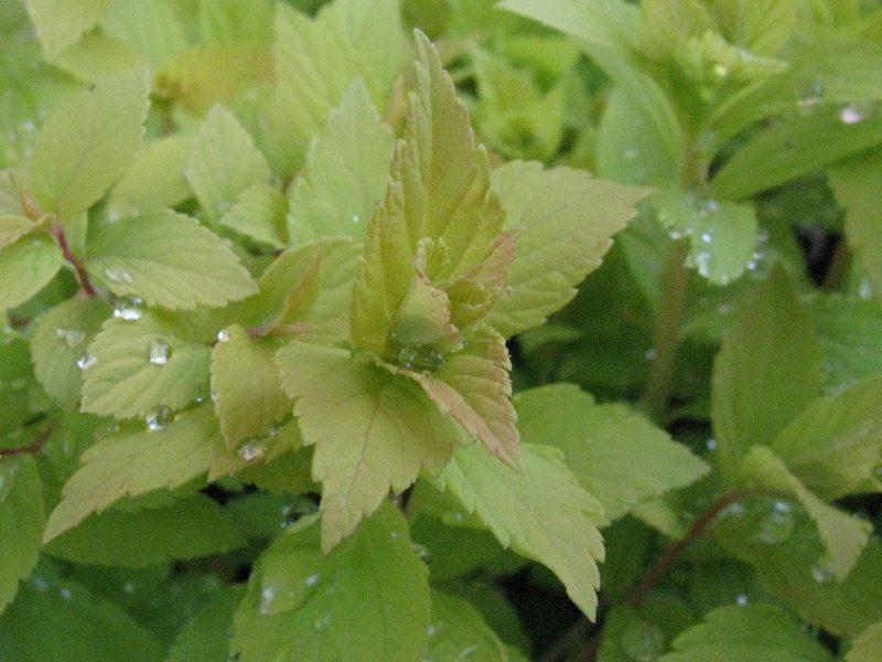 Um diese Jahreszeit liebe ich die "Golden Flame" mit ihrem gelb-bronzefarbenen Austrieb. Sobald sie blüht, verursacht sie leider schmerzende Augen - verwaschenes rosa mit bronzegelb ist ein Horror.
