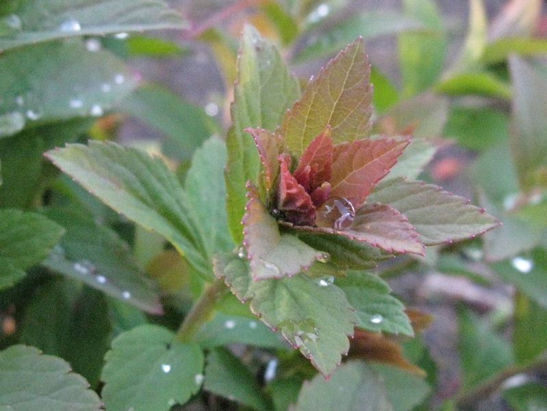 Um diese Jahreszeit liebe ich die "Golden Flame" mit ihrem gelb-bronzefarbenen Austrieb. Sobald sie blüht, verursacht sie leider schmerzende Augen - verwaschenes rosa mit bronzegelb ist ein Horror.