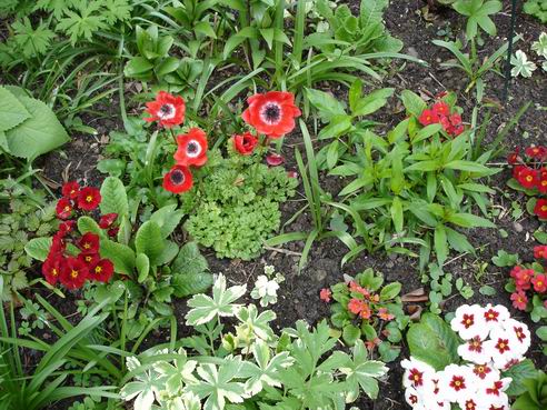 Farbkombinationen, die man sich irgendwann mal ausdenkt, lassen sich ja nicht jedes Jahr wie geplant verwirklichen, da aufgrund von Witterungsbedingungen etc. ja oft nicht die erwünschten Partner zur gleich Zeit zur Blüte kommen.Manchmal aber kommt auch was ganz Nettes unverhofft zustande. So habe ich in diesem Jahr duch den langandauernden "Austriebszustand" einiger Pflanzen eine ziemlich auffällige, aber wie ich finde, ganz interessante Paarung von leuchtenden Rottönen (Primeln, Anemone coronaria) mit dem grünlichen Gelb von austreibender panaschierter Akelei und dem Tränenden Herzen Dicentra spectabilis "Gold Heart". Teilweise kommen dann auchn noch rötliche Blattstiele oder der dunkle Austrieb von Lysimachia "Firecracker" dazu. Ein bisschen Weiß mildert dann manchens wieder ab, und das saftige Grün der neuen Blätter passt doch auch gut dazu.