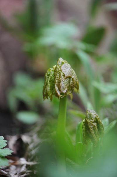 Bei mir ist sie (vermutlich cymosa) schon voll belaubt, einen Stängel hat jemand (vermutlich keine Schnecke) angenagt und das Blatt ist abgebrochen. Diphyllea wächst bei mir aus einem Asarum europaeum Teppich. Vollkommen problemlos.