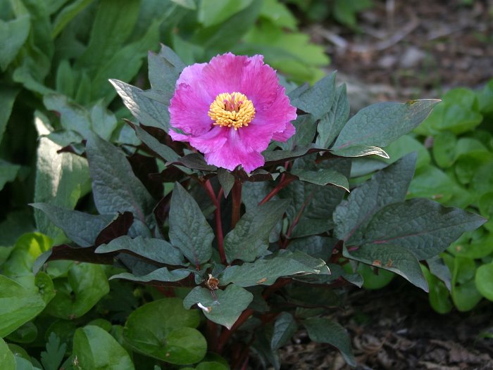 irm, ich trau sie mir fast nicht zeigen...Paeonia cambessedesii, leider heuer nur mit 1 blüte, aber wunderschön.ich habe eine absaat von der mal gemacht. da zeigen sich die meisten sämlinge cambessedesii-typisch (blattunterseite rot, blattfarbe, -form und -aderung), aber 2 ausreißer sind dabei, die gehen sehr deutlich in richtung daurica. mal sehen was da rauskommt.