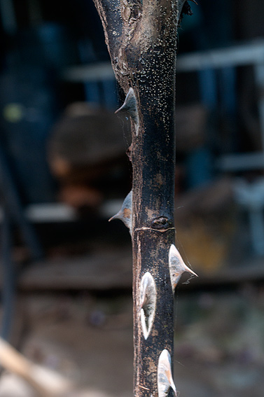 Im Hintergrund bei obigem Bild sieht man drei ziemlich schwarze alte "Ranken". Das sind drei von ca. 8, die am Dachüberstand hochrankten bis 3m hoch.Auf diesem Bild eine der drei - die mittlere schwarze - , die ich bis auf einen m kürzte und vorgestern endgültig abschneiden wollte... jeder würde wohl diesen echt schwarzen Trieb entsorgen, oder?