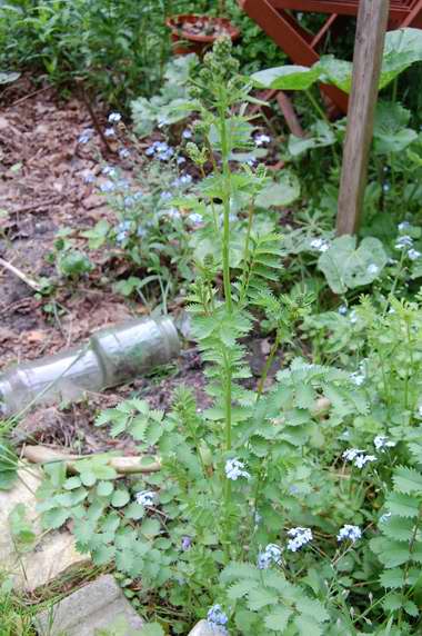 Letztes Frühjahr säte ich eine Blumenwiesenmischung aus. Unter anderem wuchsen gefiederte Blätter als Rosette, bei denen sich sonst nicht viel weiter tat. Sie verwelkten im Herbst nicht, zogen nicht ein, nix. Selbst den Kahlfrost im Februar überstanden sie grün ohne Schaden. Diesen Lenz entdeckte ich Knospenstengel, die sich nach oben schoben - und freute mich auf tolle Blüten. Neugierig schaute ich letztens nach den Farbanflügen an den Knospen, um festzustellen, dass das bereits die Blüte ist