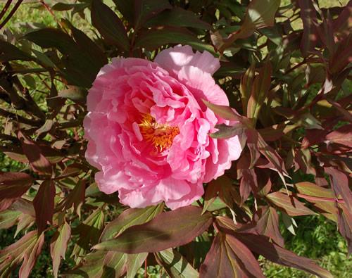 Diese Pfingstrose gefällt mir speziell der rötlichen Blätter wegen, Yachiyo-tsubaki