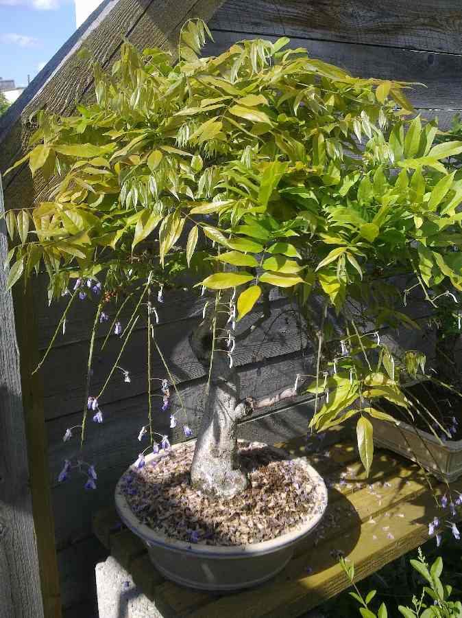 Dass sich mit viel Schnitt (und kleinem Wurzelraum) die Wisteria Wuchsmonster sogar zum Bonsai formen lassen, habe ich letztes Wochenende an diesem ca. 80 cm hohen Exemplar gesehen. Es hat trotzdem reichlich Blütentrauben gebildet - muss beeindruckend gewesen sein in Vollblüte!