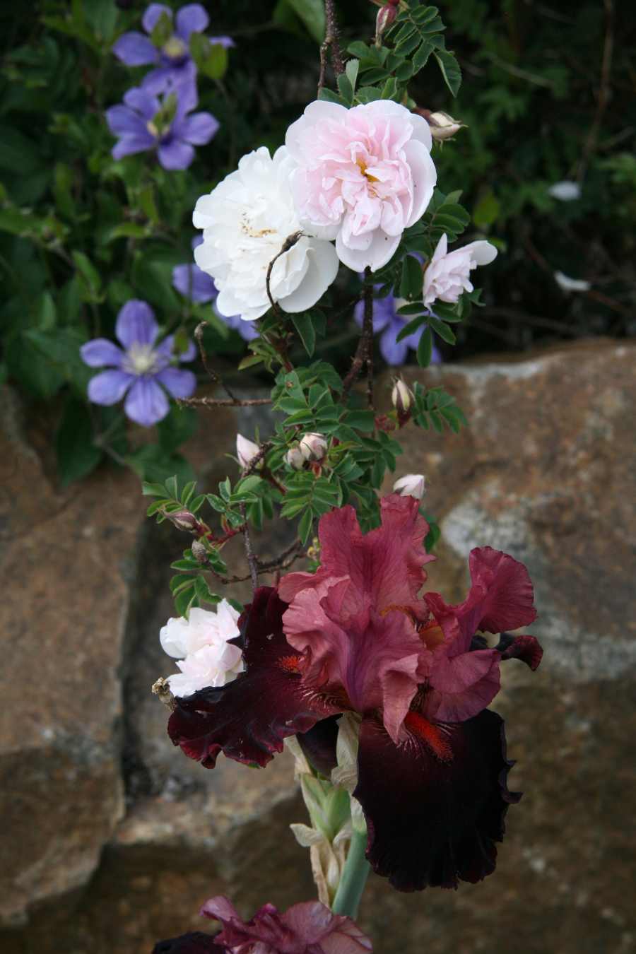 Ein kleines Detail aus dem Vorgarten: Gruppenbild mit Stanwell Perpetual, Clematis Arabella und Iris Wearing Rubies