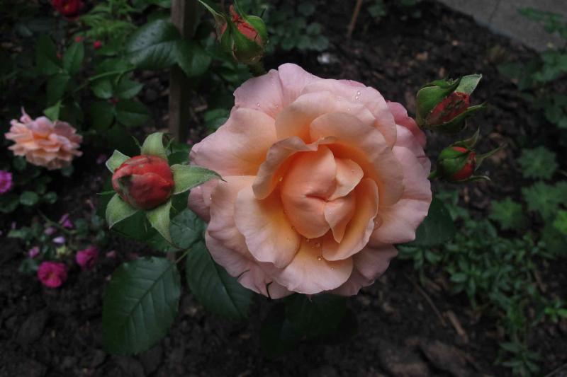 Im Parterre - sofern man das so sagen kann - habe ich im Frühjar 2011 zu den vorhandenen THs und Engländerinnen Penelope, Trier, Cornelia und Felicia gesetzt, quasi im Viereck, entsprechend der (unereglmäßigen) Form des Beetes. Felicia war als Container gekommen und hat im Vorjahr schon geblüht, ihre Knospen müssen erst aufgehen, ebenso Cornelia. Penelope war im Vorjahr sehr zurückhaltend und zeigt jetzt erstmals ein Blütenbüschel, inzwischen etwas regengeschädigt (ein anderes ist noch am Start):