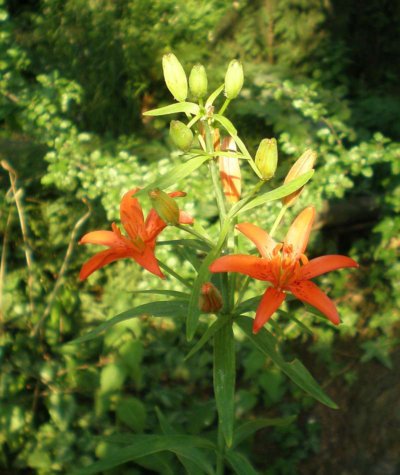 heuer blüht erstmals eine samengezogene Lilium canadense var. coccineum, daher nur eine blüte. ob canadense in meinem sandigen humusboden jemals zu stattlicher größe mit zahlreichen blüten heranwachsen kann, wird sich zeigen. ich fürchte eher nicht + kann froh sein, wenn sie mal mehr als eine blüte produzieren. eine gekaufte canadense var. coccineum produziert immerhin schon mal 2 blüten, ist aber noch nicht aufgeblüht. canadense bevorzugt schweren lehmboden. zumindest hatte ich mal eine in meinem früheren garten in schweren lehm stehen + die war sehr groß mit vielen blüten. canadense ist ohne zweifel eine der elegantesten wildlilien.