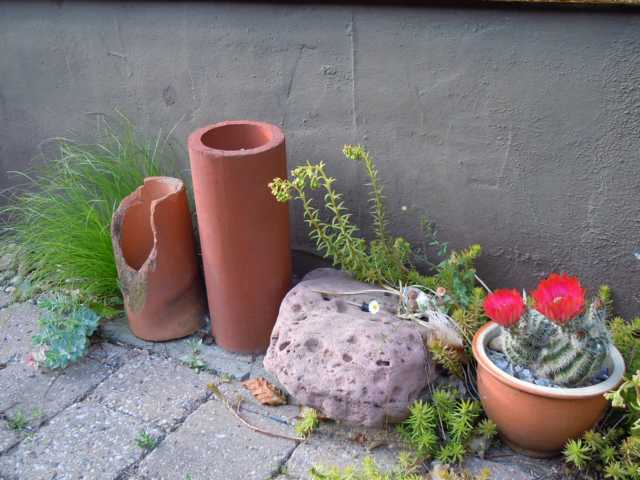(Name Kaktus leider unbekannt, winterhart, steht ganzjährig im Topf da rum; daneben Sedum "Angelina", Erigeron karvinskianus und mein Lieblingsgras Carex humilis "Hexe" )