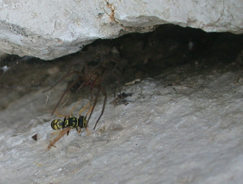 Heute morgen spielte sich ein kleines Drama ab: Die Wespe war wohl etwas berauscht von Salbei und Oreganum und fiel in die Falle einer Spinne. Trotz mehreren Attacken der Spinne kann ich vom glücklichen (für die Wespe) Ende berichten.