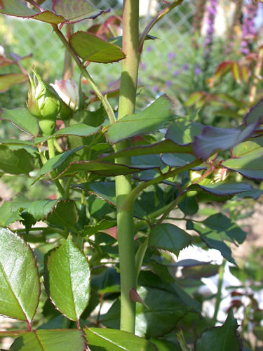 A Shropshire Lad hat hier nicht solch glänzenden und rot gerandeten Austrieb, allerdings auch recht wenige Stacheln.