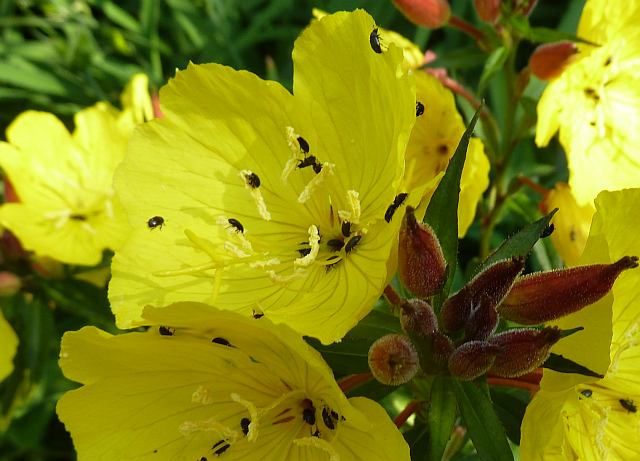Hier sind die Rapsglanzkäfer jetzt auch wieder kräftig auf dem Vormarsch. Unten auf einer Oenothera. Wenn erst alle meine gelben Taglilien anfangen zu blühen... ::)Bis dahin sitzen sie auch schon an rosa Rosen.