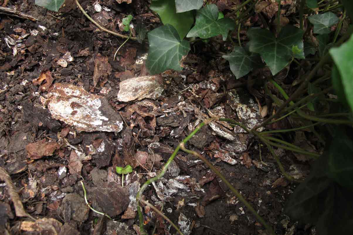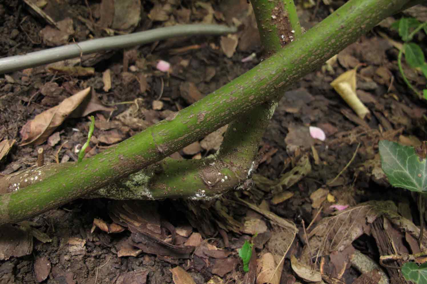 ...und weiße Pünktchen an einem weiter weg stehenden panaschierten Hartriegel, die ich schon länger bemerkt habe. Dort ist aber der Mulch seltsamerweise in Ordnung, das dürfte etwas anders sein