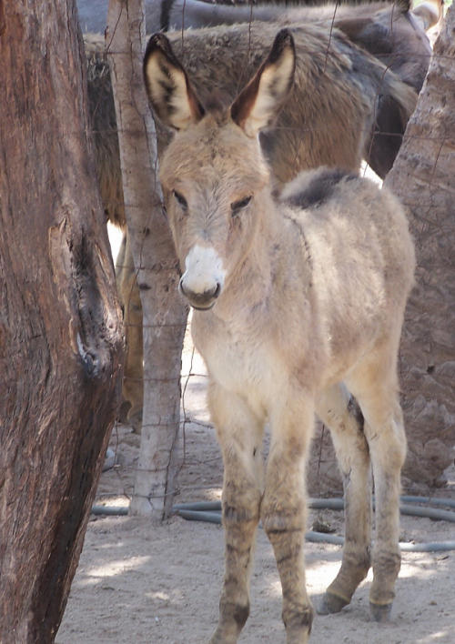Die Esel haben mehr Schatten als die Pferde, die gesattelt und ohne Wasser am Baum angeleint bleiben.