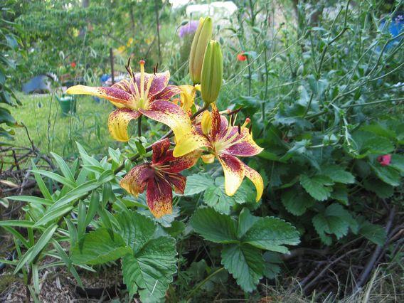 Lilium davidii blüht jetzt auch leider nur drei Stengel. Die vielen langen grasartigen Blätter sind bei der sehr gesund.