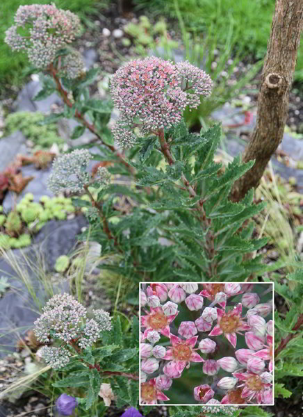 Für den Steingarten grenzwertig hoch (50cm), aber in der Sonne absolut standfest mit rötlichem Stiel:Sedum telephium ssp. fabariaMan beachte das schmale Laub mit starker Zähnung.