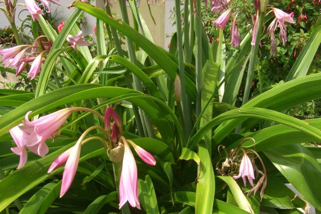 Gilt auch für dieses Monstrum hier: Crinum x powellii. Es ist eine ex-schutzbedürftige Zwiebelpflanze und stand erst mal vor Jahren bei mir unter Glas, bis mir diese Zwiebelkeulen zu fett wurden.Bedauerlicherweise ist sie inzwischen so mächtig, dass ich sie schon nicht mehr transportieren kann.