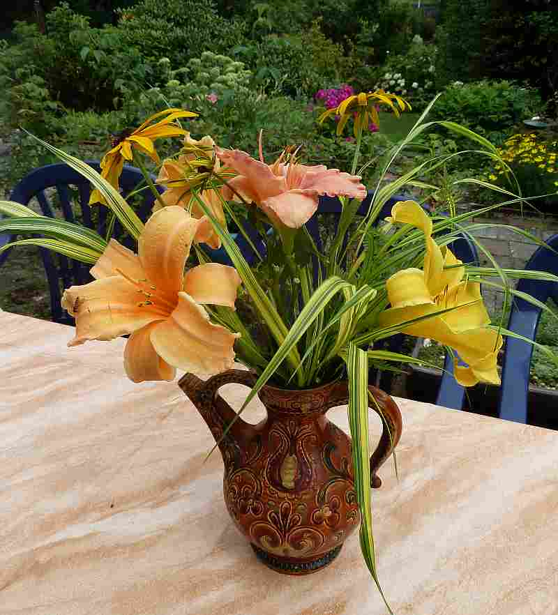 Callis,ein schöner Strauß mit Taglilien! Liebe GrüßeElkeWeitere Fotos heute abend. Gleich gibt es in meinem Garten Kaffee und Kuchen für die Dorfbewohner .