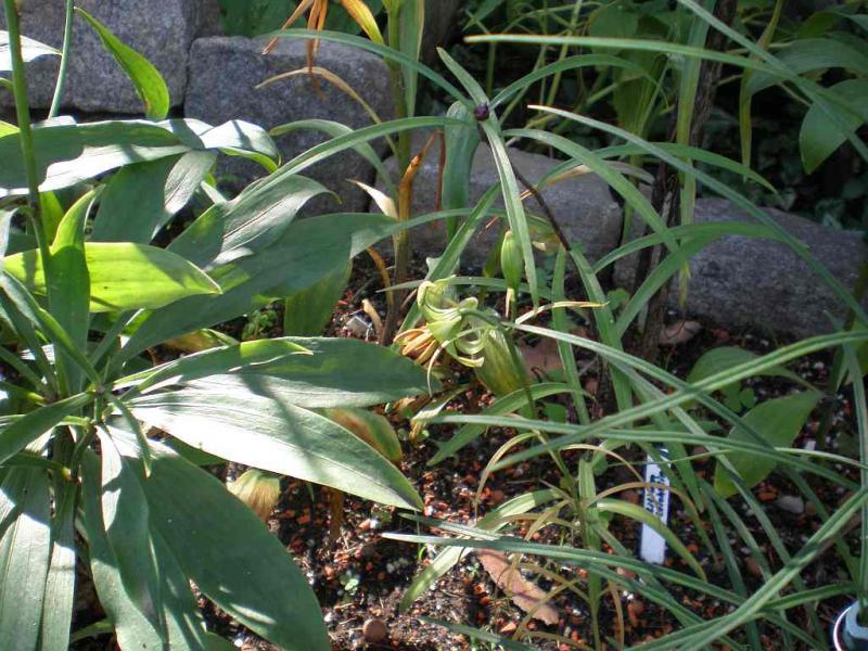 Letztes Jahr blühte es auch um diese Zeit, Foto vom 12.7.2011 (war ganzjährig im Topf).Die Farbe der Tepalen ist deutlich (hell)grüner als bei Deinem, Knorbs.Mit welchen anderen Pflanzen vergesellschaftet Ihr denn Eure L. fargesii? Zwischen den anderen Lilien geht es völlig unter. Dabei ist das zarte Dingelchen so ein Hübschi, das einen besonderen Platz verdient.
