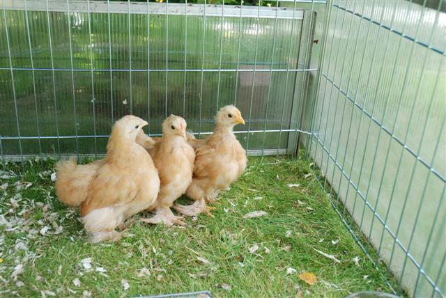 Die Kleinen dürfen noch nicht in den alten Bestand. In jedem bestehenden Hühnerlauf scheint es Keime zu geben, die den Winzlingen nicht gut tun, also haben sie einen umfunktionierten Hasenlaufstall , abgedeckt mit Nachthaus und Plastikplane für Sturzregen. Ich denke, dass ich nächstes Jahr auch mal ein Huhn brüten lasse, ist nett für Enkels.