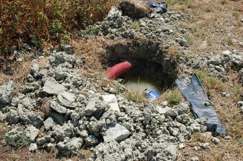 Die Erde besteht aus grüner Ton/Lehmerde. Wenn ein Loch gemacht wird, bleibt das Wasser darin liegen, ohne abzufliessen.Hier, leider nicht so deutlich auf dem Foto. Aber die Tonlehmklumpen daneben vom Aushub waren grün.