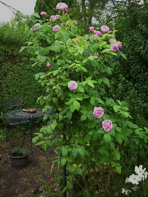 sieht so aus der Entfernung jetzt aber sehr ähnlich aus wie HdB! Vor allem das Laub! Honorine hat vielleicht ein wenig kugeligere hängendere Blüten in denen das dunkle rotviolett nicht ganz so dunkel ist, also weniger Kontrast im Scheckenmuster.Also lieber blühfaul beim zweiten Flor als gar kein 2. Flor.und hier nochmals ferdinand pichard am rosenbogen. er ist schon wieder bei 1,80m, aber kann noch einiges mehr. honorine de brabant hab ich auch mal gehabt, die war mir beim zweiten flor zu blühfaul.