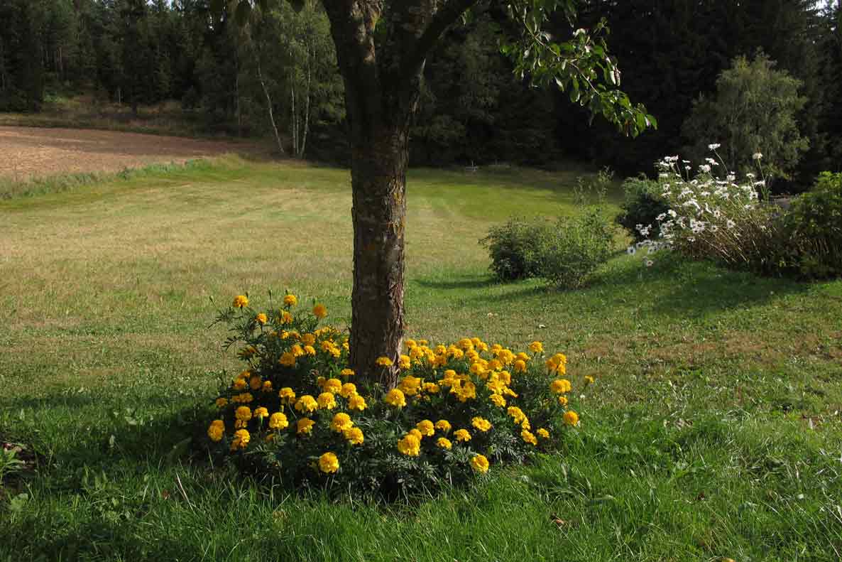 Um den Apfelbaum hab ich heuer statt Ringelblumen Tagetes gesetzt. Blühen und blühen, fast ohne gießen. Die Margariten am Stein sind immer so verwegen