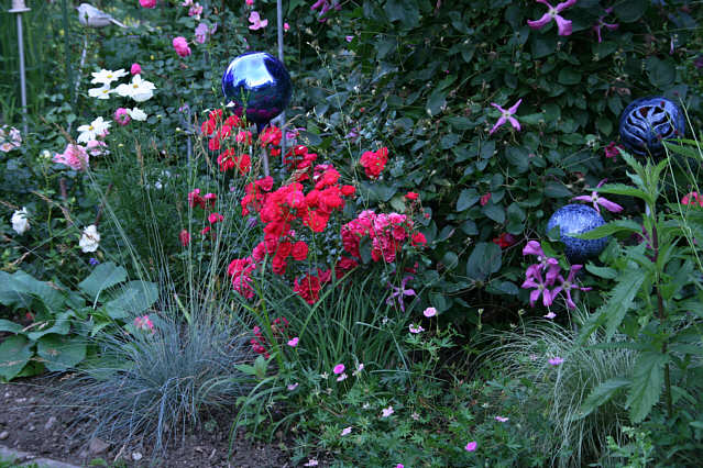 Ich bin auch kein großer Fan von Bodendeckern. Ich finde sie meist ein wenig öde und belanglos. Und dass die wenigsten gut duften, ist auch ein großer Nachteil! Hatte aber ein ganz nettes Beet mit Sommerwind und Katzenminze (die diesen Februar leider nicht überlebt hat), und das sah schon sehr romantisch aus zusammen. Es ist eine Frage der Kombination mit passenden Stauden, finde ich. Auch würde ich die Bodendeckerrosen mit großzügigem Abstand zueinander pflanzen, so dass es keinen wirren, blühenden Teppich ergibt, sondern die einzelne Pflanze auch ein wenig für sich wirken kann. Die Sommerwind würde ich nicht als dauerbühend bezeichnen, die blüht bei mir als allerletzte Rose erst auf (Ende Juni), ab dann allerdings überschwenglich und pausenlos bis zum Frost. Ich war am Wochenende in "Laubjergs Rosenhaven" In Dänemark, und dort waren sehr schöne Vergleichsbeete mit Bodendeckern. Mir gefallen die weißen am besten, bisher hielt ich "Schneeflocke" für die schönste, wegen ihrer vergleichsweise großen, schönen Blüten, dem knackegesunden Laub, und weil ich Geriesel von Blütenblättern auf den Boden grundsätzlich gerne mag. Allerdings ist mir im Rosarium eine weiße Bodendeckerrose von Poulsen sehr positiv aufgefallen, die bei uns weniger bekannt ist. Sie heißt "White Cover" oder auch "Kent", war ebenfalls noch gesund und reichblühend trotz der Jahreszeit und des vielen Regens im Juni und Juli, und ergab insgesamt ein sehr harmonisches Bild. Leider lassen beide Sorten zu wünschen übrig, was den Duft angeht, aber man kann ja nicht alles haben, und wenn ich was dauerblühendes, pflegearmes suchen würde an einem Platz, wo die Optik wichtiger ist als der Duft, dann wären diese beiden ganz vorne dabei (kombiniert mit rot blühenden Purpurglöckchen und / oder blauer Katzenminze...). Aber um mal beim Thema zu bleiben - ich habe ja nicht allzu viele Rosen, aber bei mir im Garten dauerblühend definitiv RiB, und fast ohne Pause (und vor allem auch von Ende Mai/Anfang Juni bis zum Frost) blühend Ingrid Bergman, Duftwolke und Winchester Cathedral. Schneewittchen definitiv nicht, sie will und könnte auch, aber leider verregnet es ihr so ca. die Hälfte aller Blütenschübe! Auch Princess of Wales (Harkness) wäre gerne dauerblühend und gibt sich extrem Mühe, hat aber dasselbe Problem wie Schneewittchen.