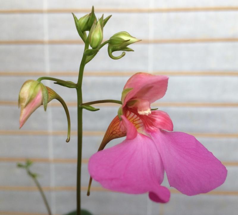 Impatiens flanaganae hat die erste Blüte geöffnet. :DDiese Art hat zwar keinen Caudex, aber unterirdische Knollen von beachtlicher Größe und zu den winterharten Impatiens passt sie auch nicht. Bislang ein völlig unkompliziertes Gewächs - Knolle eingetopft, wächst und gedeiht am Ostfenster.