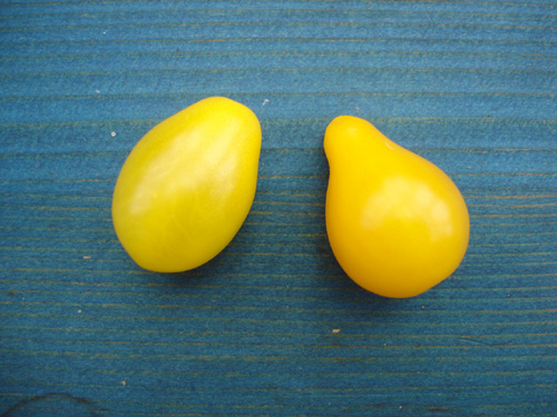 @Wattemaus:Die Gelbe Dattelweintomate hat einen weniger ausgeprägten Hals als die Gelbe Birne und trägt viel üppiger.Links auf dem Bild: Gelbe Dattelwein