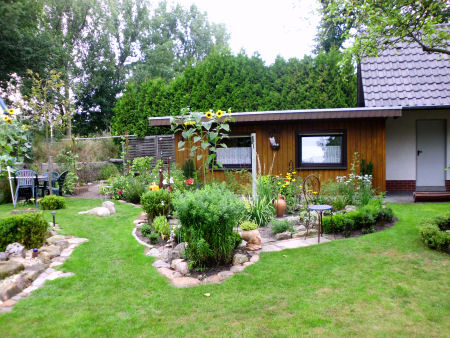 Hallo Elke,das Häuschen steht ein wenig einsam und ohne Verbindungin Eurem Garten rum, ich würde versuchen, es farbig mit einzubinden, mit Pflanzen, die einen ähnlichen Ton haben, z.B. rostfarbene Helleniums oder Pflanzen mit mattgelben Blüten.Das spricht übrigens nicht gegen Jos Konzept,im Gegenteil,ich beziehe mich nur auf die Farben.schöne Grüsseschalotte