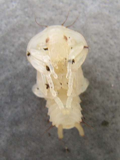 Ich habe heute unterm Flieder gejätet, als mir etwas Weißliches auffiel. Natürlich dachte ich sofort an Dickmaulrüsslerlarven, aber dieses Ding bewegte sich ruckartig. So sieht es auf dem Rücken liegend aus.