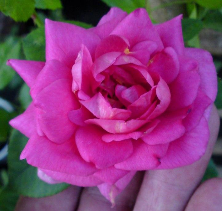 So; nun ist Madame endlich aufgeblüht; ich habe leider nur Bilder von gestern Abend, da ich übers Wochenende ein paar Tage in den Bergen war:Der Rose geht's eigentlich gut, ich hab sie allerdings immer noch im Topf und etwas stiefmütterlich behandelt, das Substrat war wohl etwas sehr mager, so dass sie nicht wahnsinnig viele Neutriebe machte diesen Frühsommer. Für eine sehr schön entwickelte Knospe reichte es allerdings, leider ging ich kurz vor dem Aufblühen gut 3 Wochen in den Urlaub und als ich zurückkam, konnte ich dann eine Matschball-Mumie bestaunenDas Wetter war aber auch gar grässlich, sehr kalt und regnerisch....Nun treibt sie schön durch (der Austrieb ist nun auch rot wie bei den Eltern) und hat eine neue Knospe angesetzt - diesmal wird sie schön gehätschelt und dann gibt's hoffentlich auch Bilder